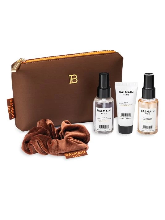 Limited Edition. This four-piece set comes contained in a neoprene cosmetic bag and includes a velvet scrunchie with three mini hair care essentials. Made in France.