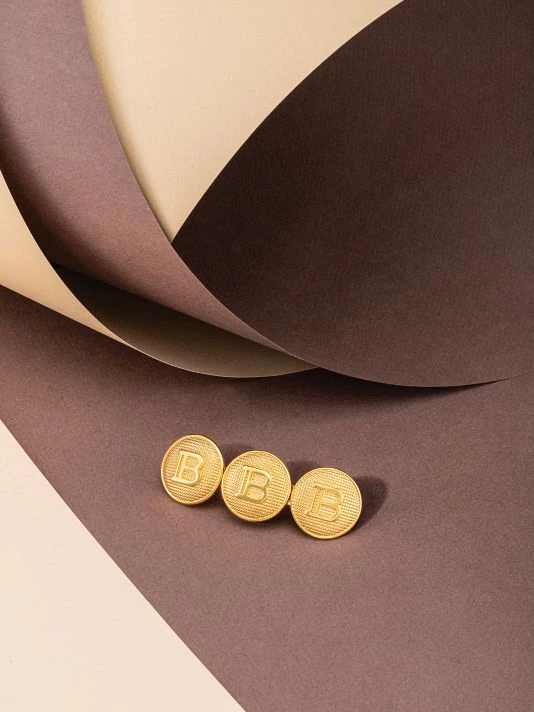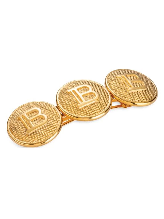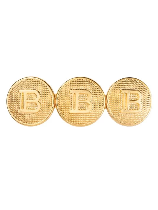 Inspired by the iconic buttons of Balmain’s signature blazers, this 18 karat gold plated barrette pour Cheveux is an easy add-on to any hairstyle.