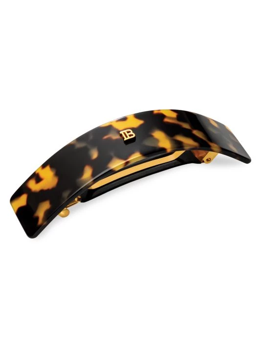 A large hair barrette made from durable cellulose acetate designed with the Balmain’s signature 14K gold-plated “B” logo. The extremely strong yet flexible material is hypoallergenic and gentle to the hair and scalp. The hair accessory features a high quality genuine French clip underneath the barrette to ensure perfect grip on the hair. The hair clip is especially designed for normal to thick hair and can be worn as a real statement hairpiece to hold hair back from the face, adorn a ponytail or enhance an up-do. Acetate. Made in France.