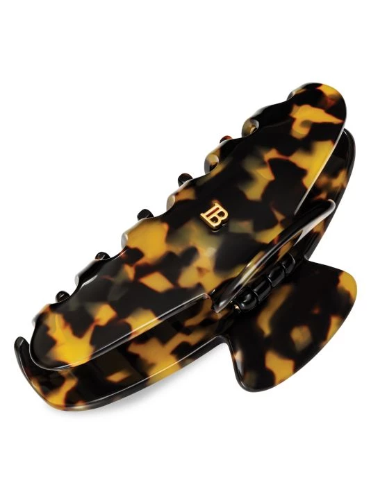 A large handcrafted claw clip made from durable cellulose acetate designed with the Balmain’s signature 18K gold-plated “B” logo. The extremely strong yet flexible material is hypoallergenic and gentle to the hair and scalp. The large clip is especially designed for thick and long hair and works as a real statement piece when clipped into the hair. Acetate. Made in France.