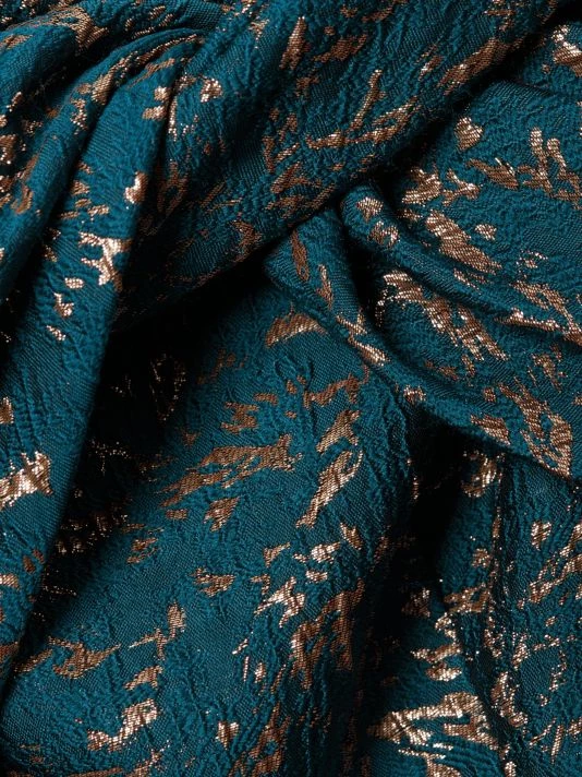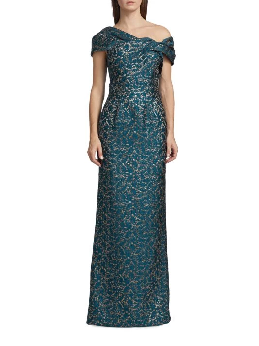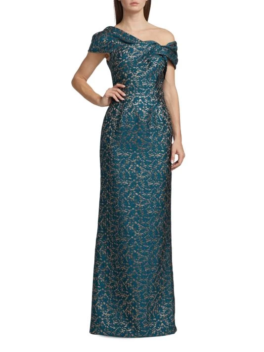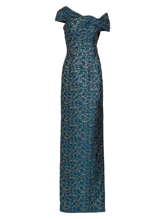 Teri Jon by Rickie Freeman’s jacquard gown features an off-the-shoulder neck with an asymmetric twist and short sleeves.