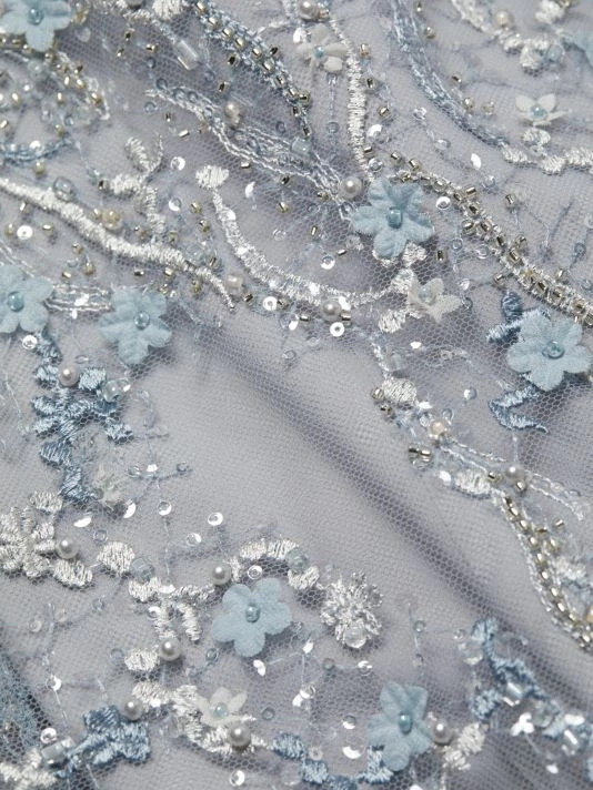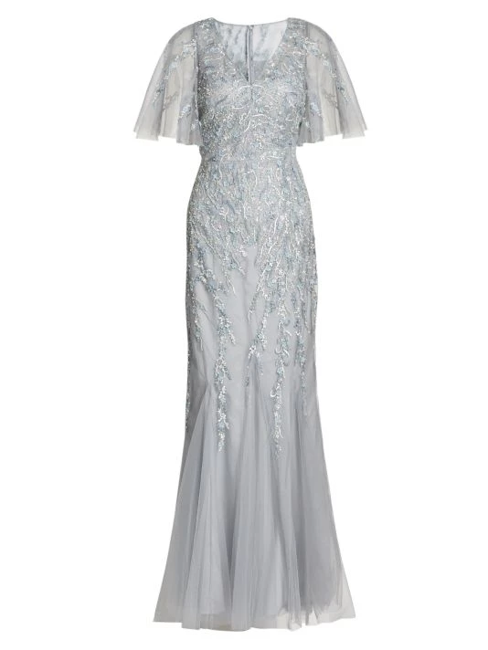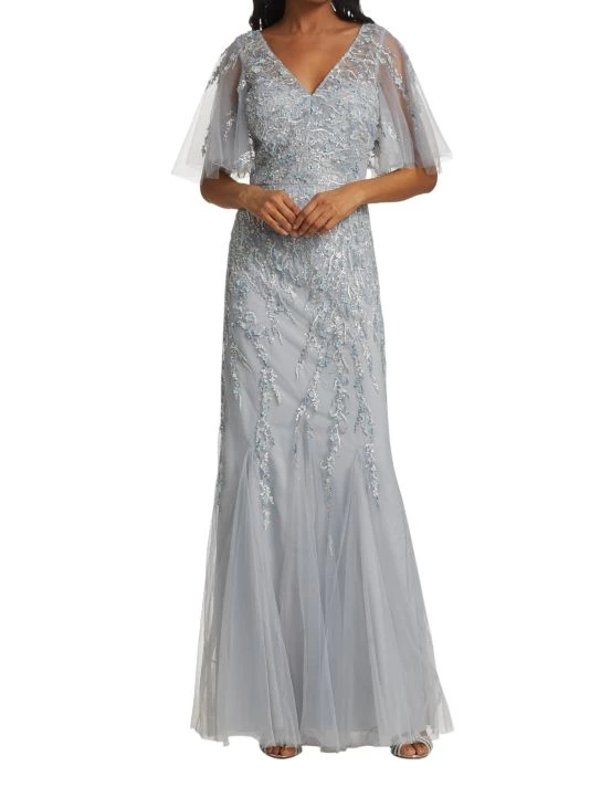 Ethereal tulle gown flaunting enchanting embroidery and airy flutter sleeves.