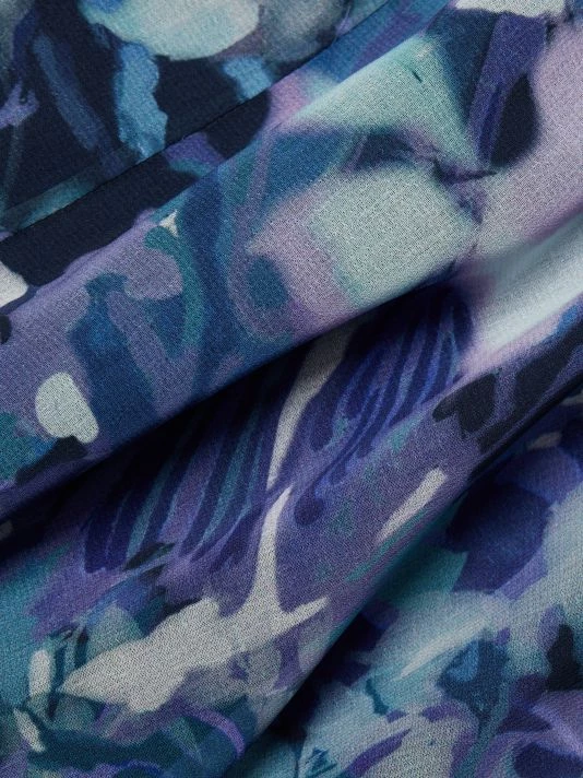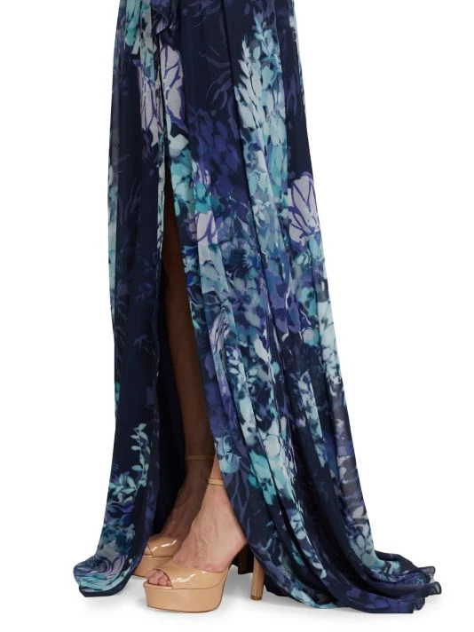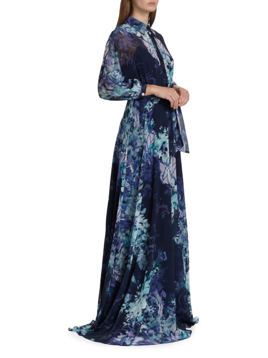 Crafted of chiffon, Teri Jon by Rickie Freeman’s floral printed gown is detailed with a point collar, long sleeves, and a belted waist.