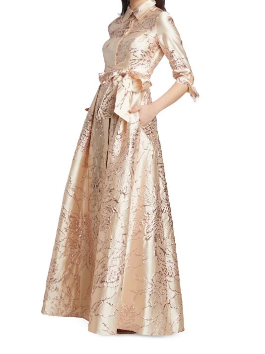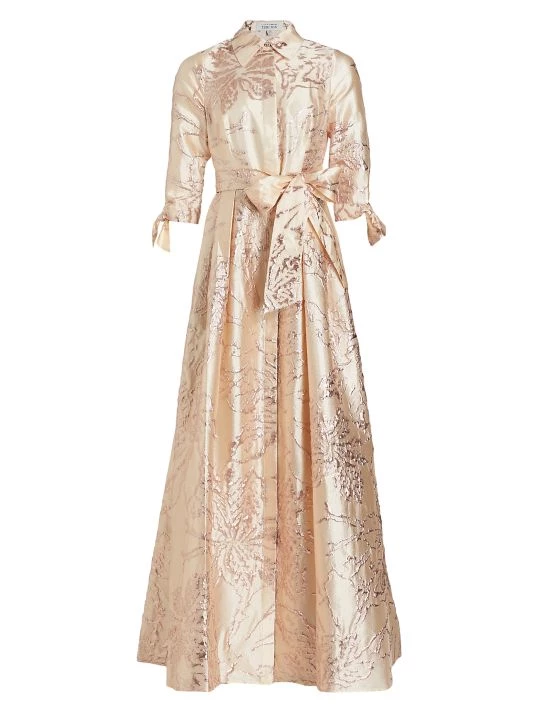 Fit-and-flare gown with abstract metallic jacquard patterning and a self-tie front.