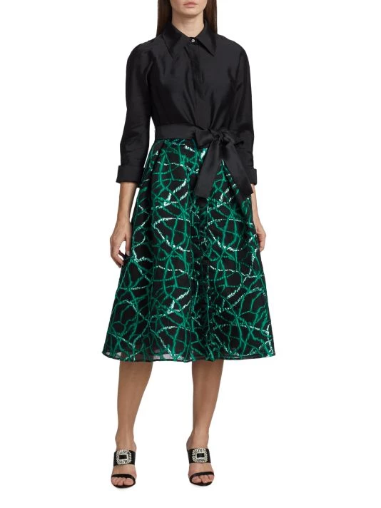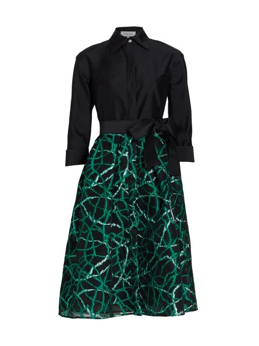 Teri Jon by Rickie Freeman’s taffeta and jacquard shirtdress features a point collar, long sleeves, and sash bow waist.