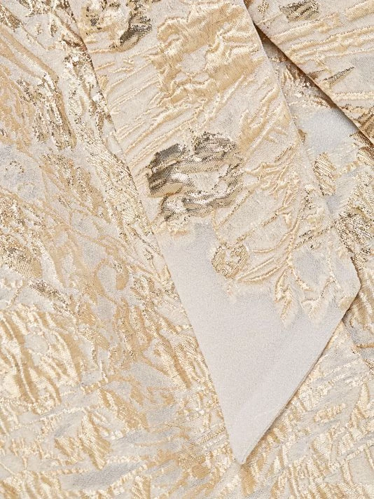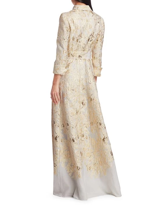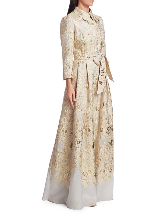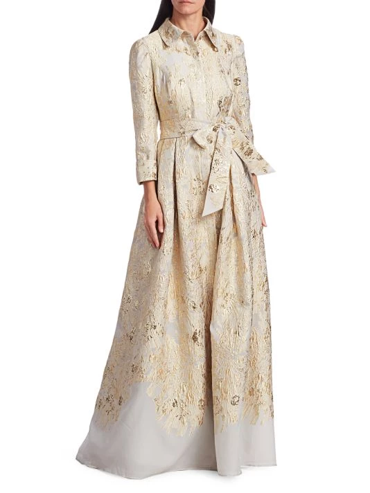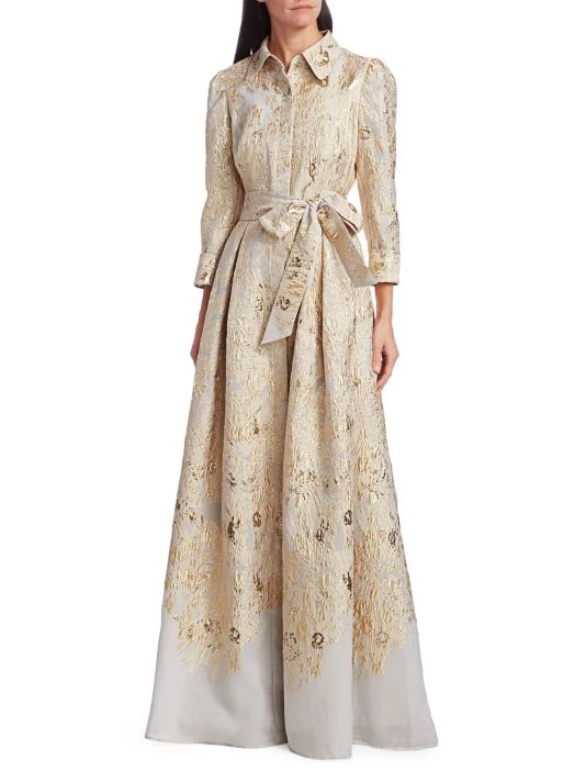 A regal shirt-styled gown crafted with rich metallic brocade.