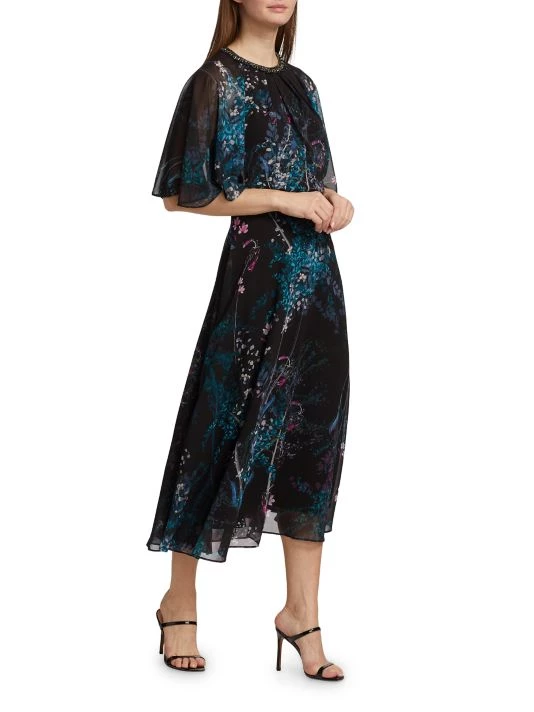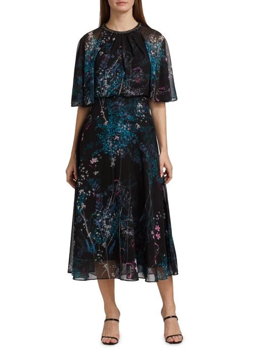 Crafted of floral-printed chiffon, this Teri Jon by Rickie Freeman dress is designed with flowy capelet sleeves.