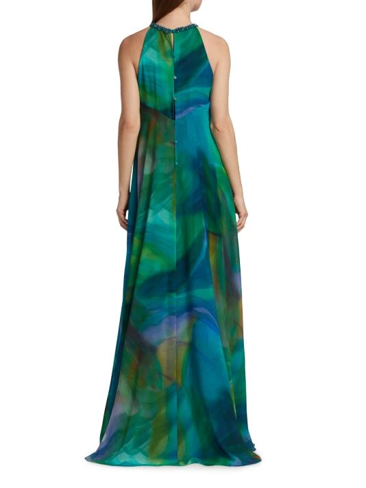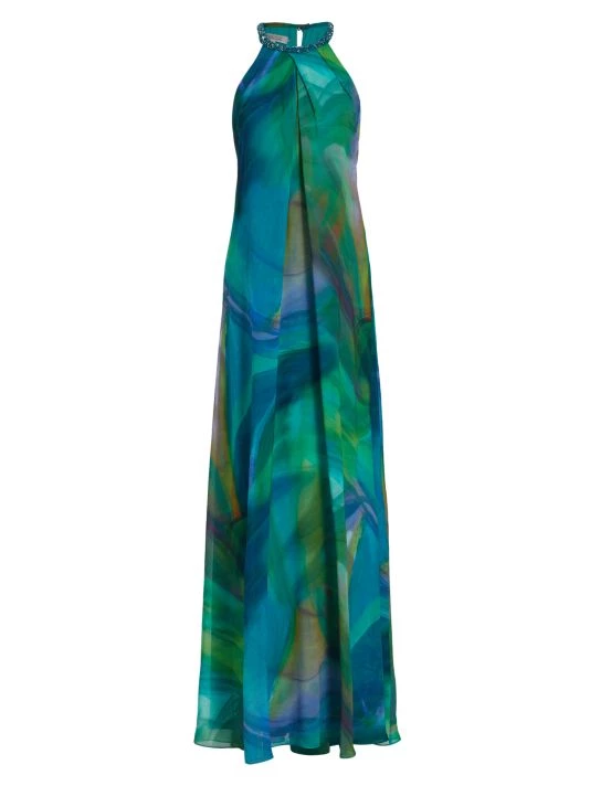 Crafted of watercolor printed chiffon, this Teri Jon by Rickie Freeman dress is designed in a halter style at a floor length.