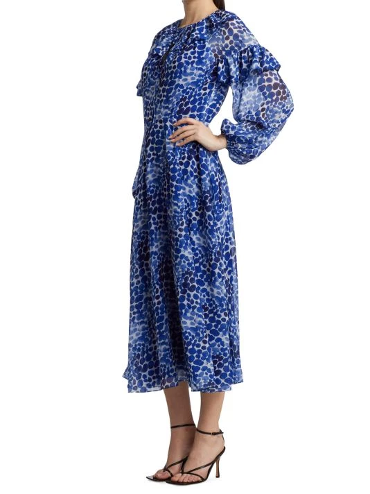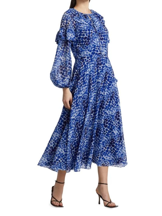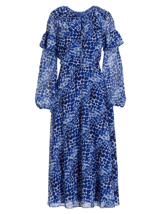 Boasting voluminous billowy sleeves, Teri Jon by Rickie Freeman’s midi-dress is expertly crafted of abstract polka dot chiffon. This luxurious piece is detailed with elegant ruffled tiers.