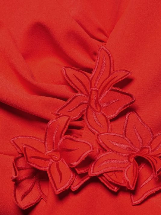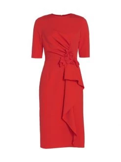 Crafted of smooth crepe, this midi-length dress by Teri Jon for Rickie Freeman is detailed with a cascading ruffle at the front.