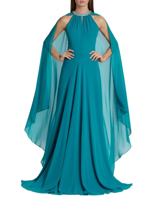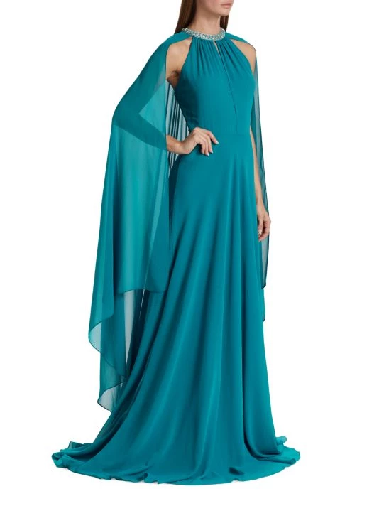 This Teri Jon by Rickie Freeman gown features a crystal-embellished round neck with a keyhole detail. A statement cape finishes this flowing A-line style.