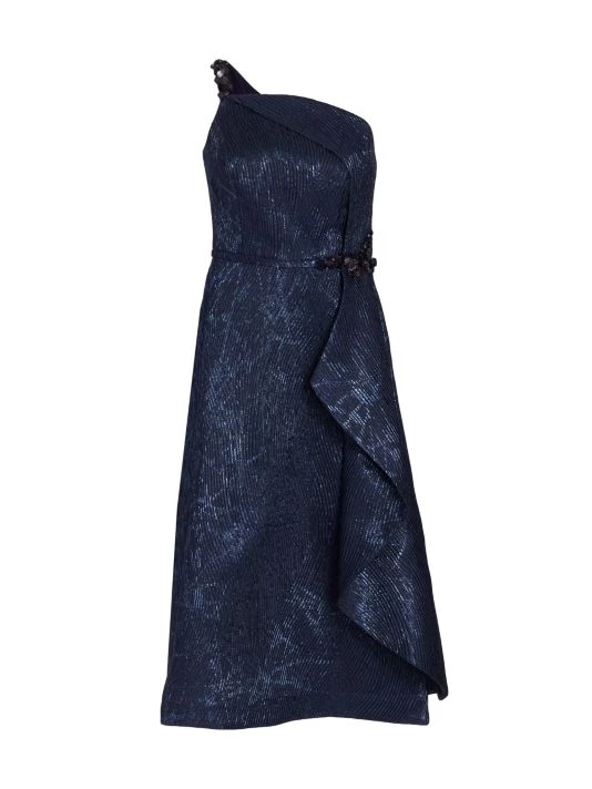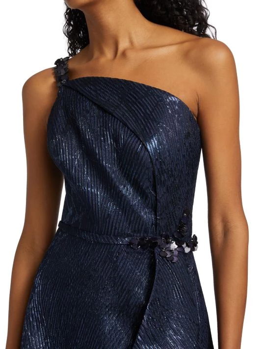 One-shoulder midi-dress with textured metallic jacquard patterning and tonal sequin embellishments at tank strap and waist.
