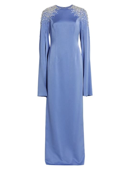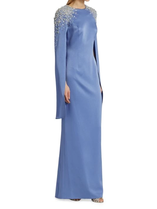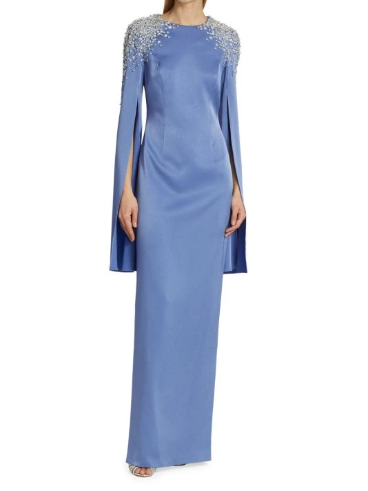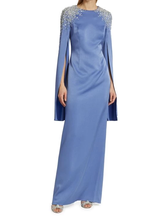 This elegant satin gown is embellished with beads at the shoulders and boasts split sleeves.