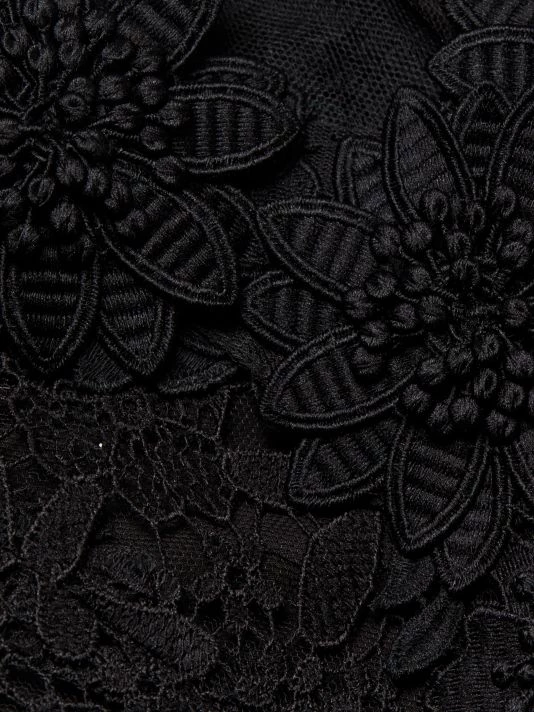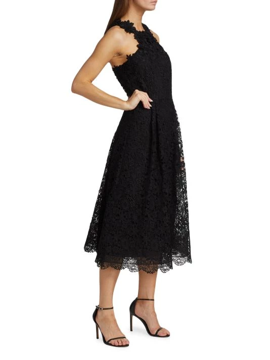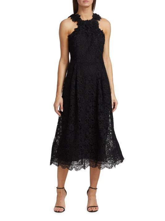 Designed with three-dimensional floral appliqués at the neck, Teri Jon by Rickie Freeman’s midi dress is crafted of floral lace embroidery. This piece is finished with a voluminous flared skirt.