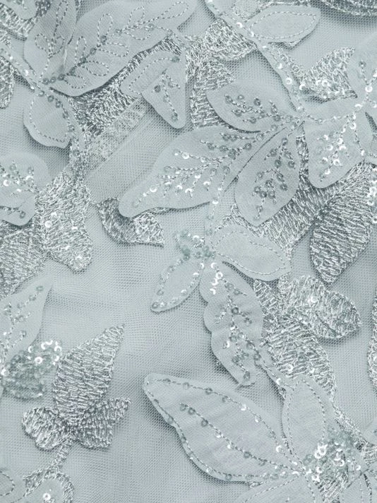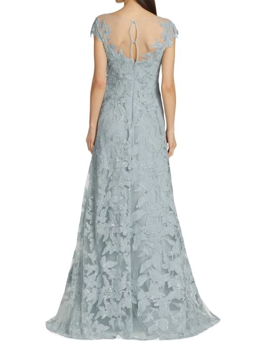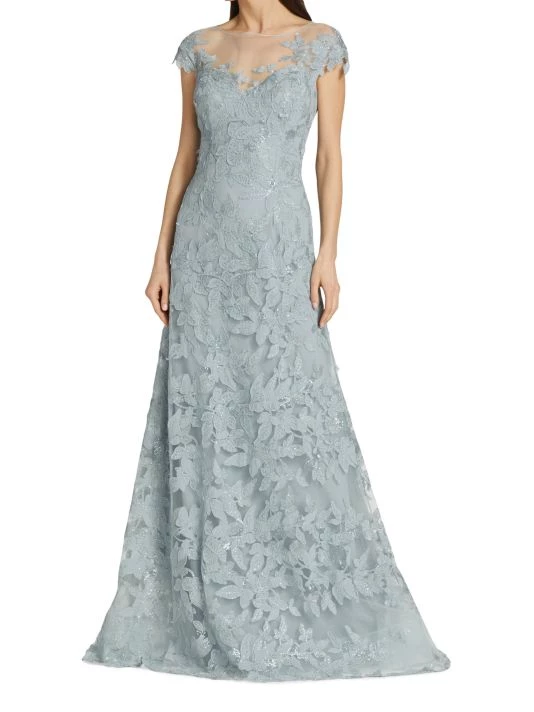This whimsical A-line gown shimmers with sequined floral appliqués throughout the design, showcasing an illusion neckline.