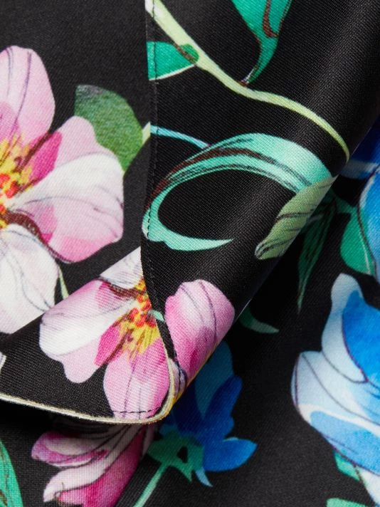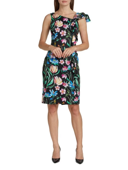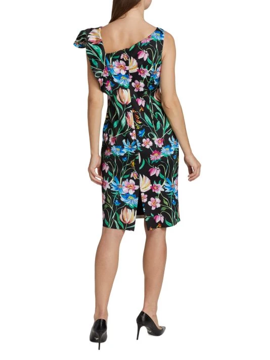 Teri Jon by Rickie Freeman’s romantic cocktail dress boasts an asymmetric design, blooming with romantic florals and trimmed with ruffles.