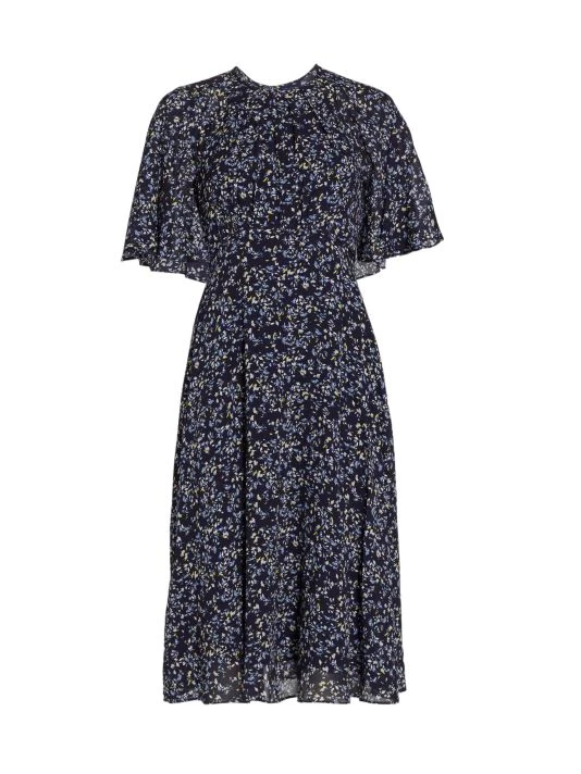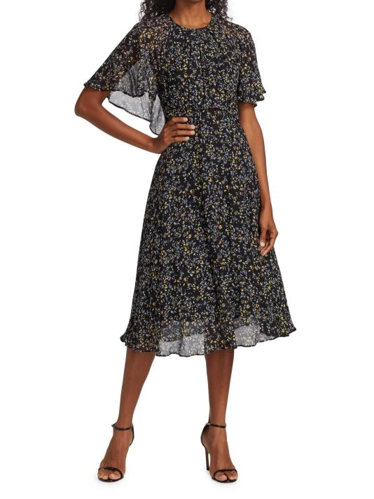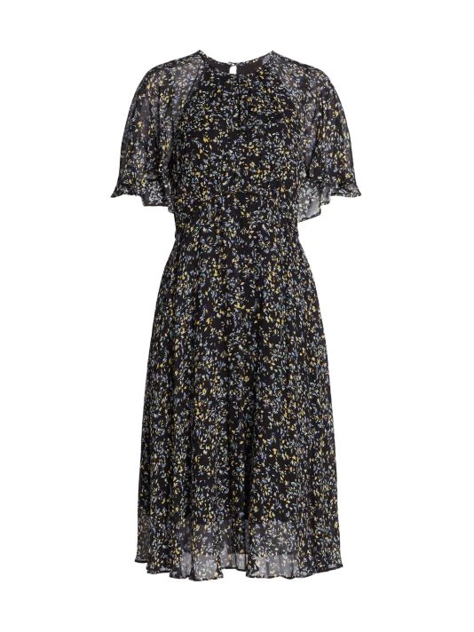 Floral cocktail dress, cut in airy polyester georgette with a cape overlay.