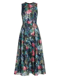 Crafted of floral jacquard, this A-line Teri Jon by Rickie Freeman dress is designed in a sleeveless style with a pleated skirt.