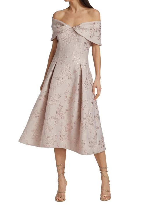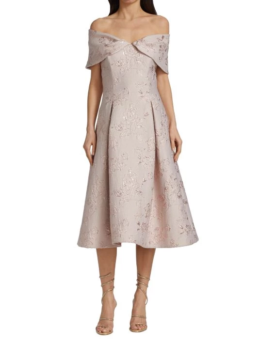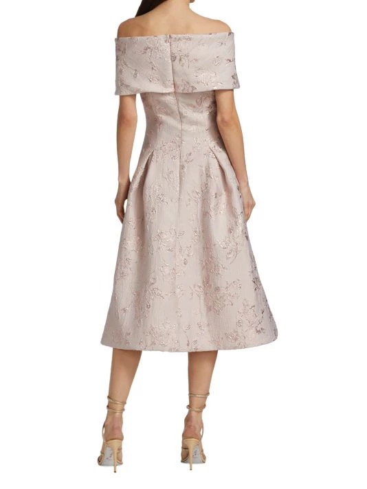 An elegant off-the-shoulder silhouette defines this fit-&-flare floral jacquard cocktail dress.