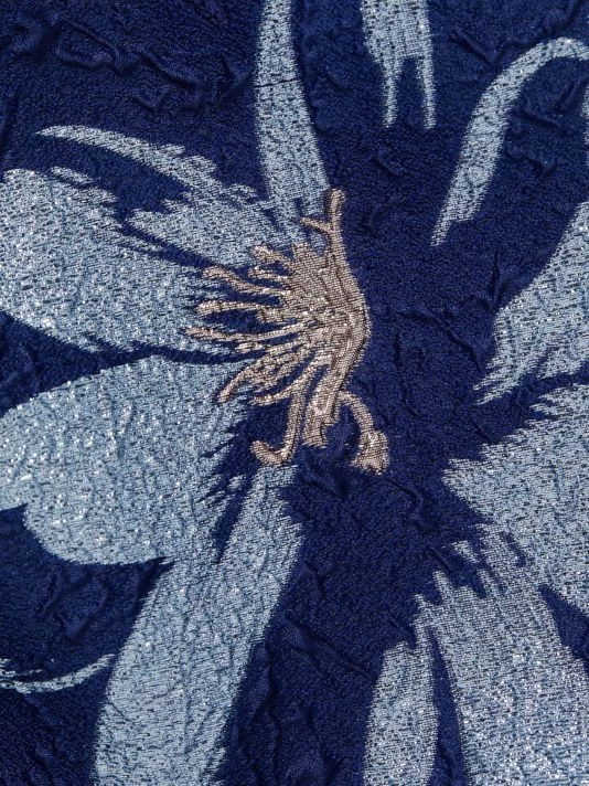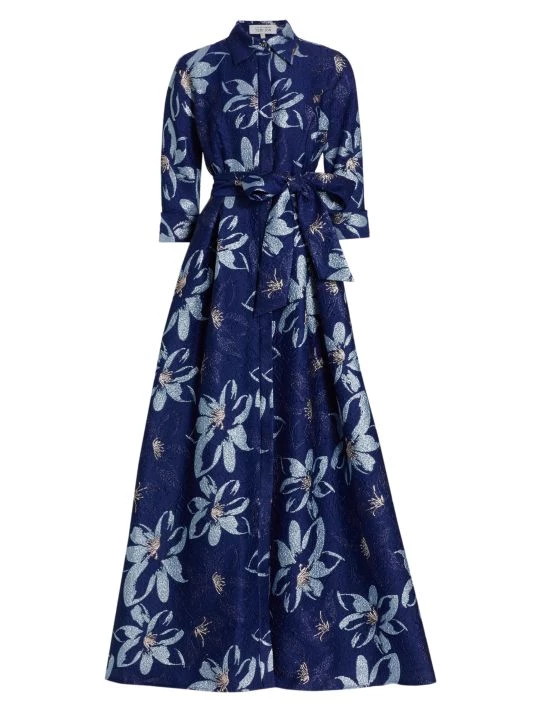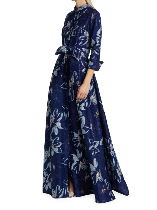 This jacquard gown features a floral pattern with a shirtdress-style design.