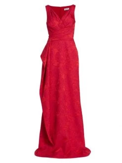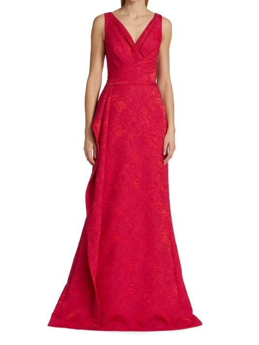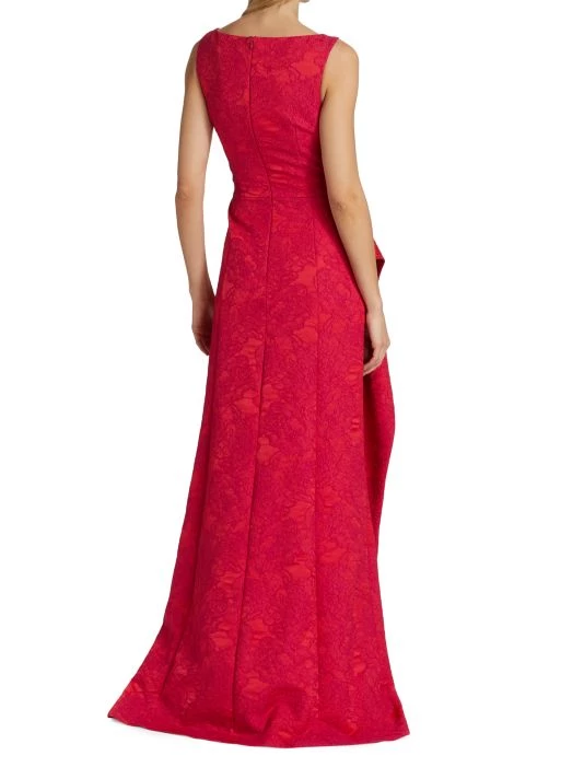 Teri Jon by Rickie Freeman’s floral jacquard gown is adorned with a surplice neckline and a ruffled side accent.
