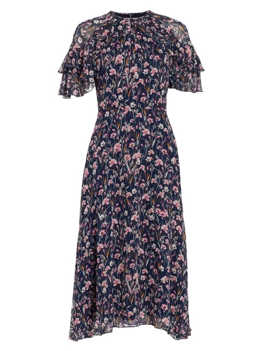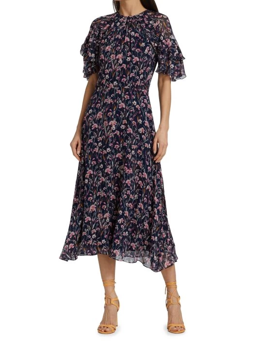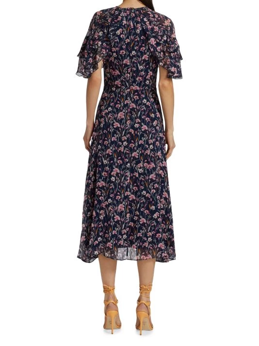 This midi-dress is complete with tiered ruffle sleeves and painterly floral print.