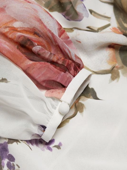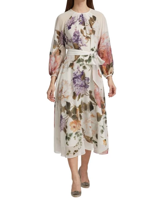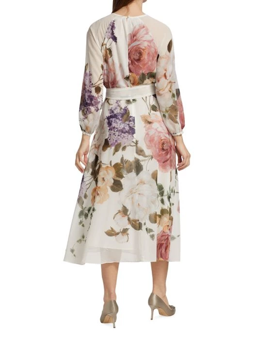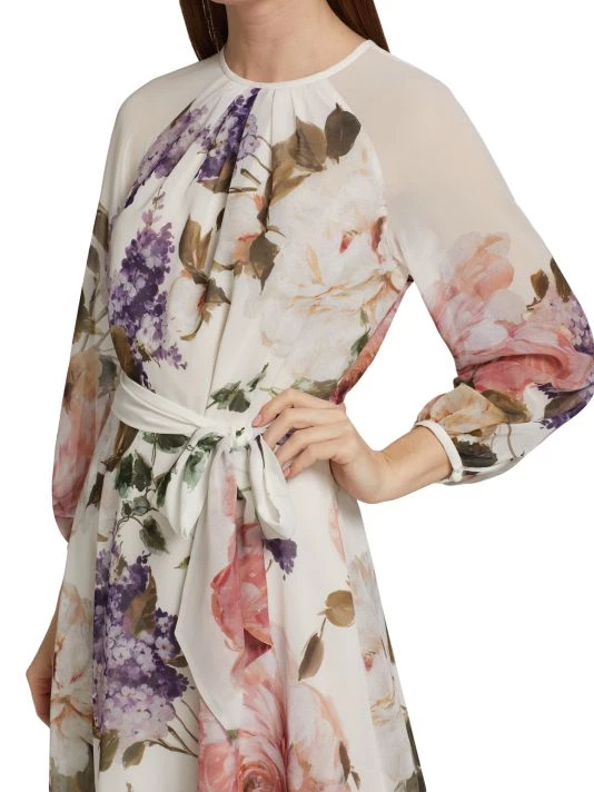 This romantic cocktail dress from Teri Jon by Rickie Freeman blooms with soft florals, highlighting the waist by the cinching self-tie belt.