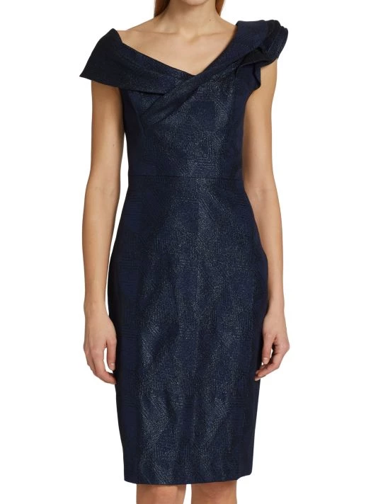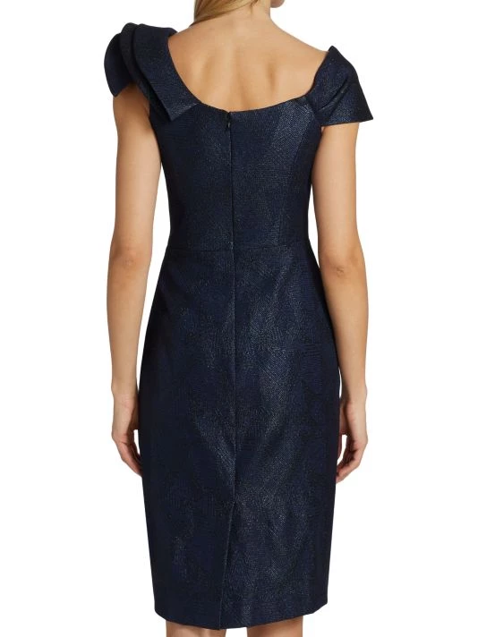 This glitter-embellished dress features a layered neckline and ruffled cap sleeves.