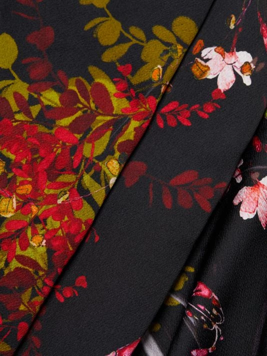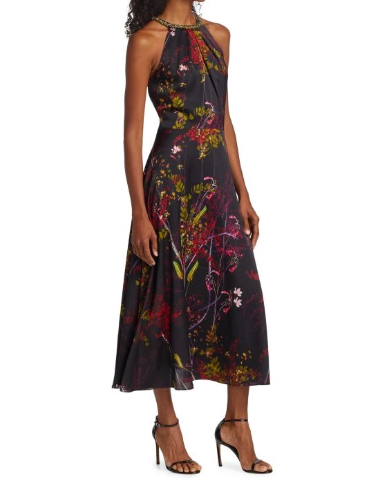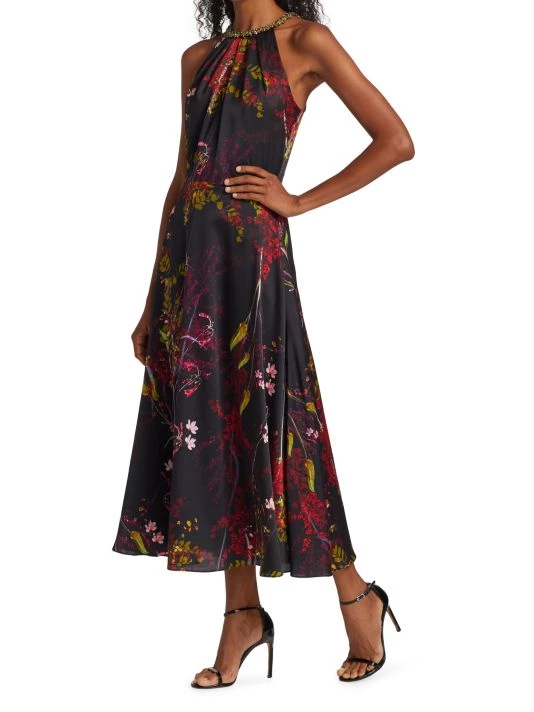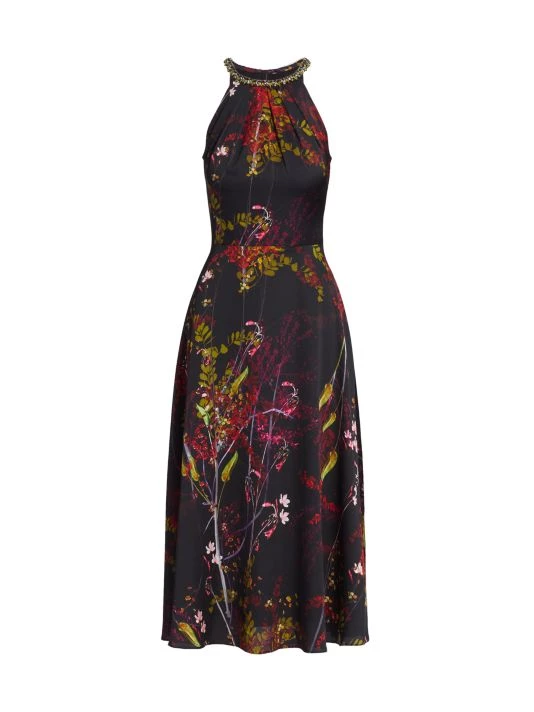 A jeweled neckline adds sparkle to this hammered satin floral-print cocktail dress.