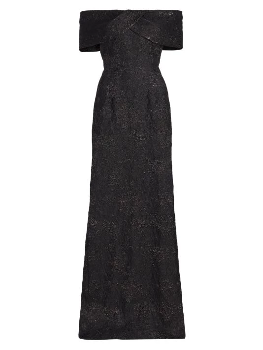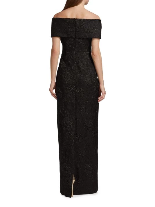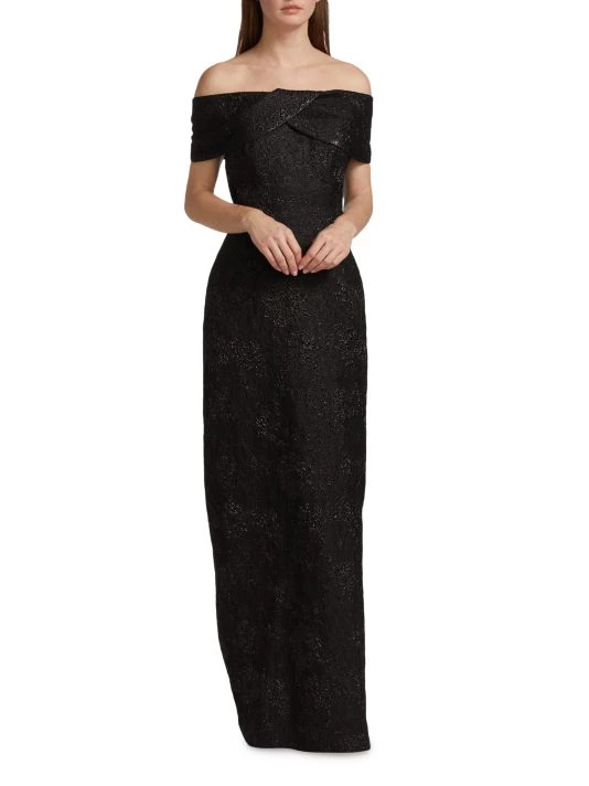 Crafted of tonal jacquard, this Teri Jon by Rickie Freeman gown is designed in an off-the-shoulder column style.