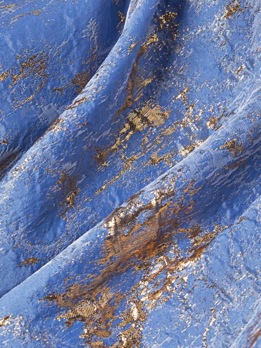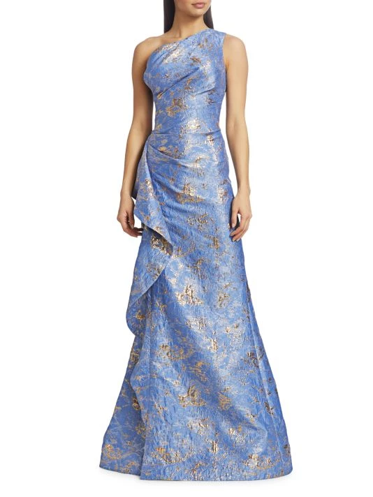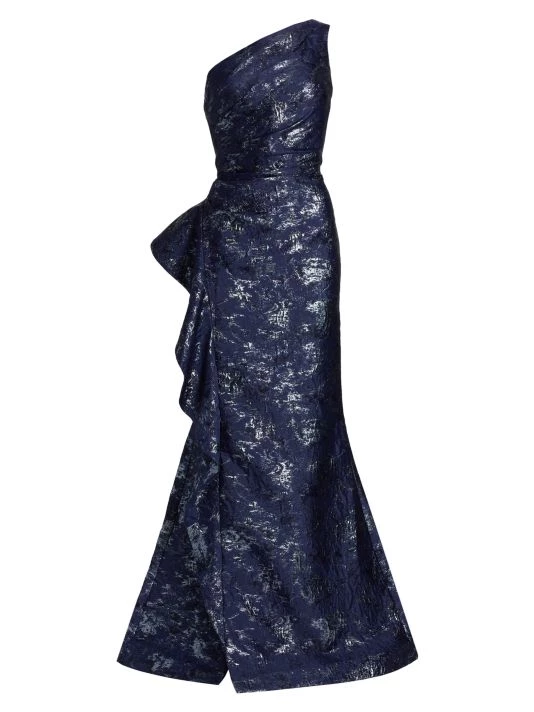 Fitted gown with an asymmetrical neckline, ruffle draped side and metallic detailed jacquard fabrication.