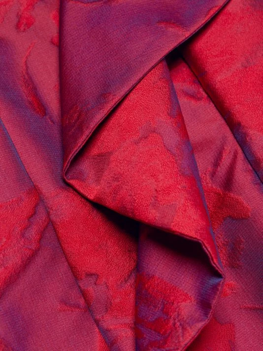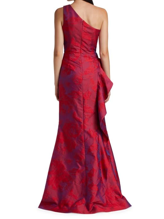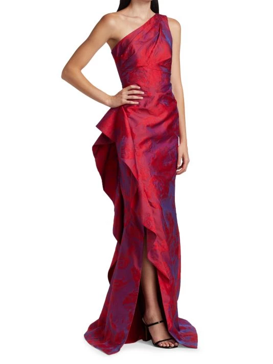 Chic one-shoulder gown presents a vibrant jacquard pattern, features a ruched waist with cascading ruffle starting at the hip and concealing front slit.