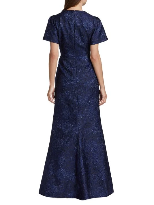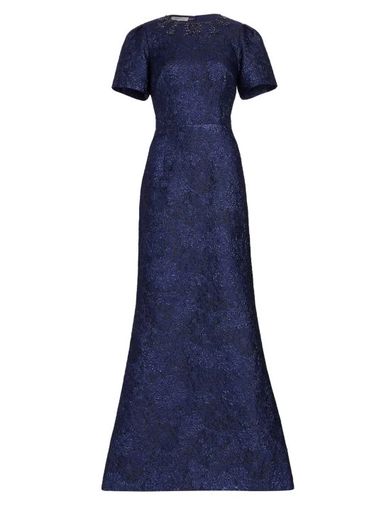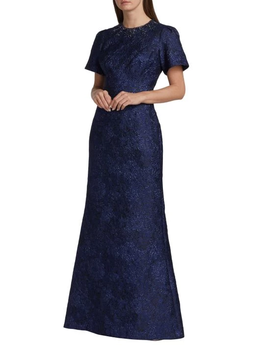 Crafted of metallic jacquard, this Teri Jon by Rickie Freeman gown is finished with a sparkling bead collar and short sleeves.
