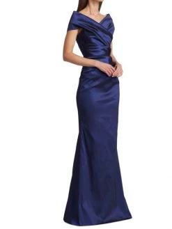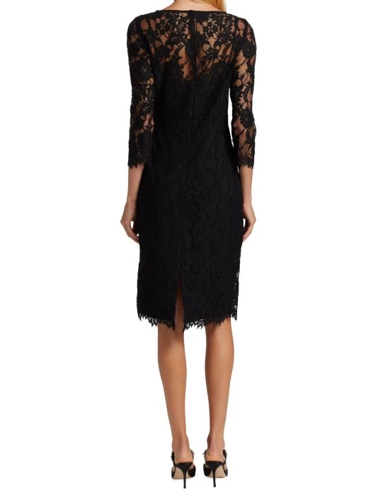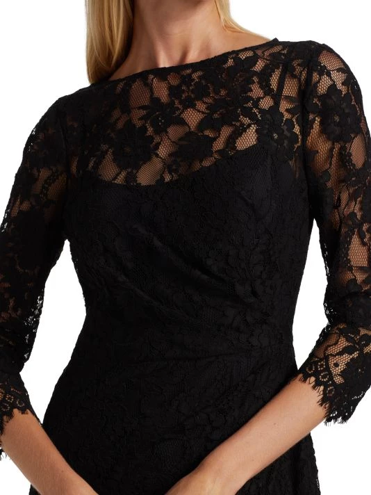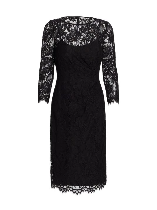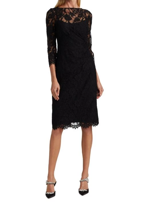 Elegant sheath dress with a shirred waist in a lacy fabrication.