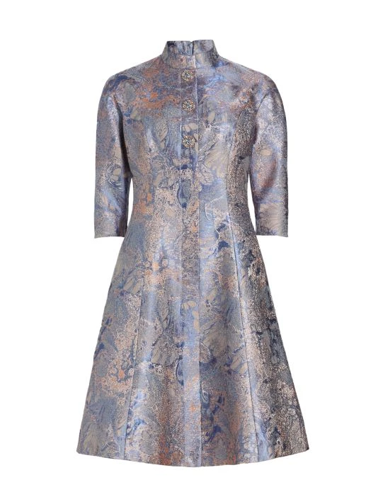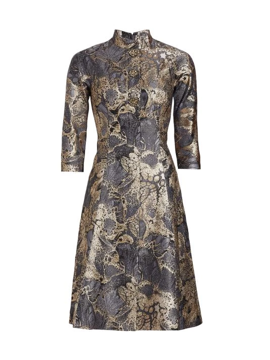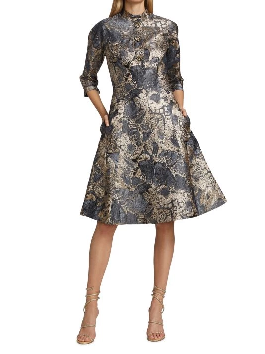 This A-line dress is made of metallic jacquard with multicolor designs.