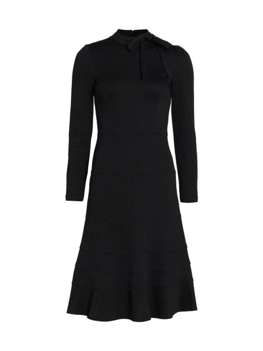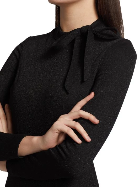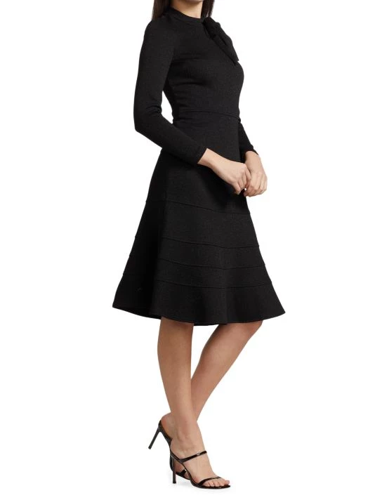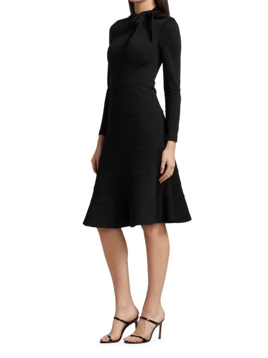 This long sleeve A-line dress is made of metallic fabric with a bow detail at the neckline.