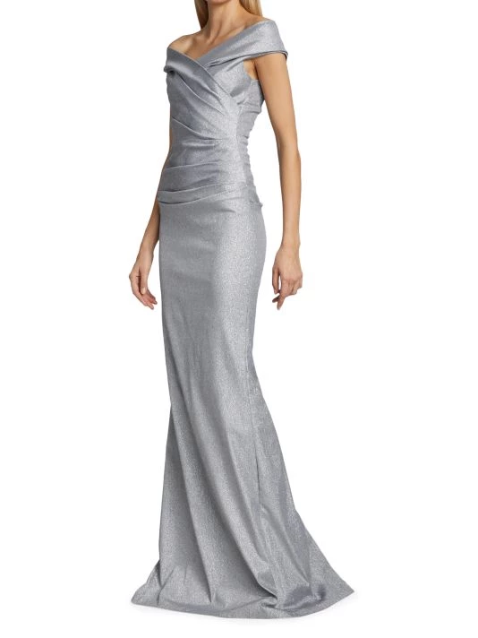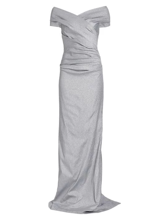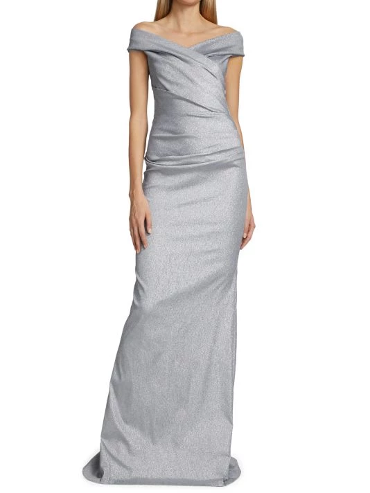This column gown is made of sparkling metallic fabric featuring an off-the-shoulder neckline.