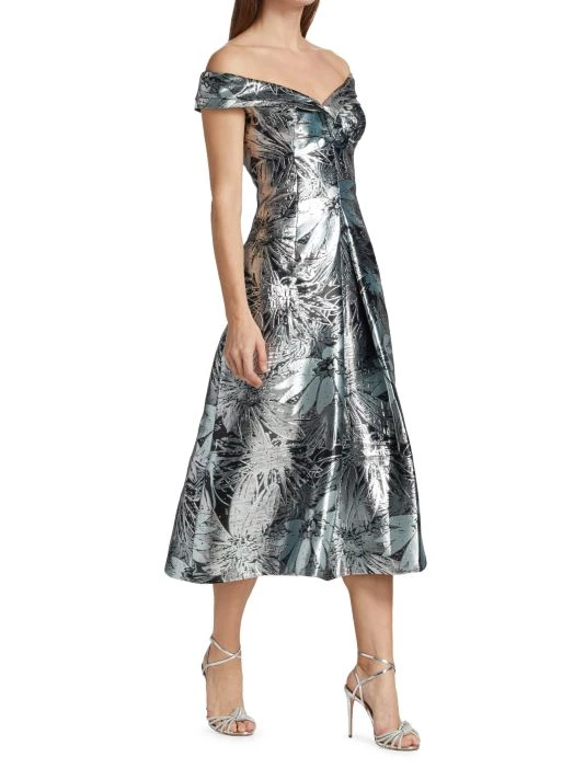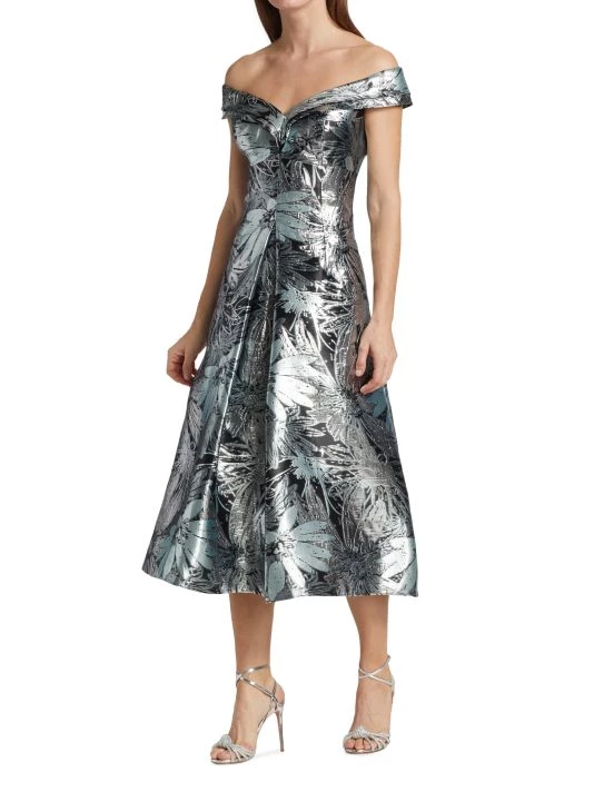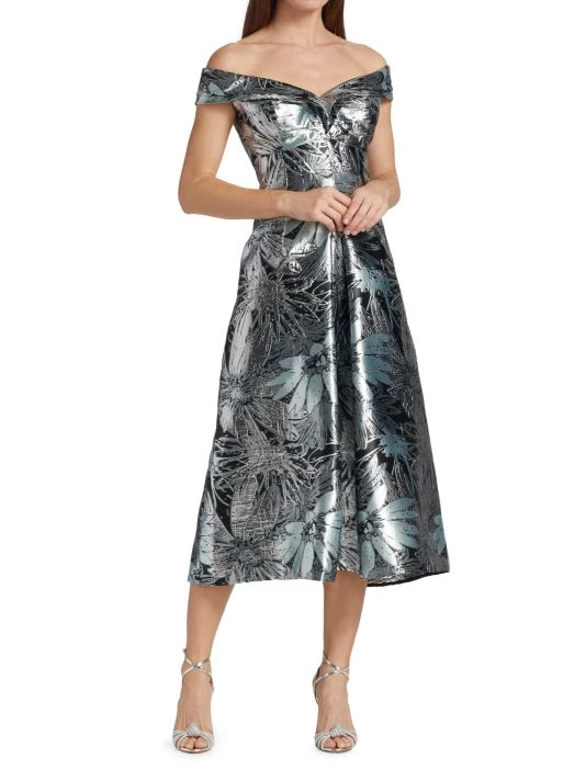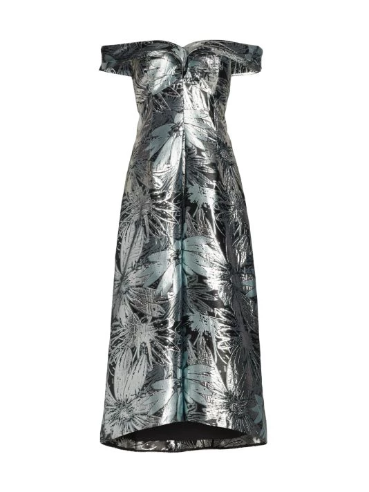Regal off-the-shoulder dress with a metallic floral print, in a traditional A-line silhouette.