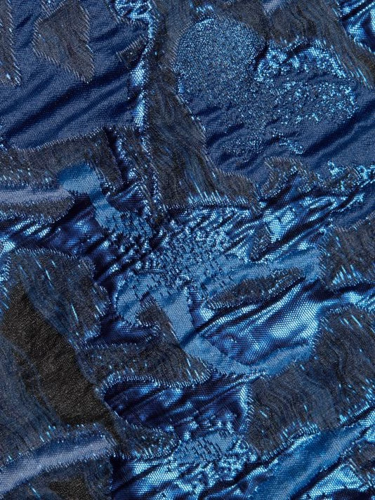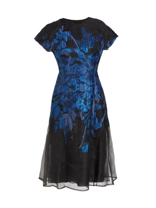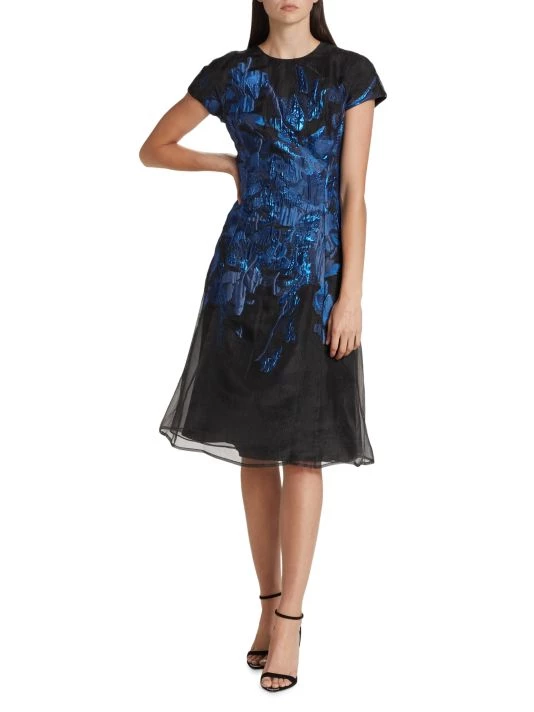 Boasting a flared silhouette, Teri Jon by Rickie Freeman’s layered knee-length dress is complete with a textured metallic-floral pattern.