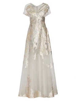 Metallic jacquard lends shine to Teri Jon by Rickie Freeman’s pleated gown, designed with a sheer organza overlay.