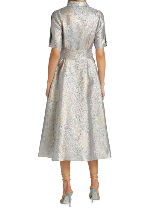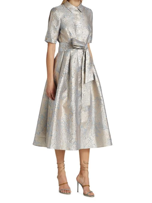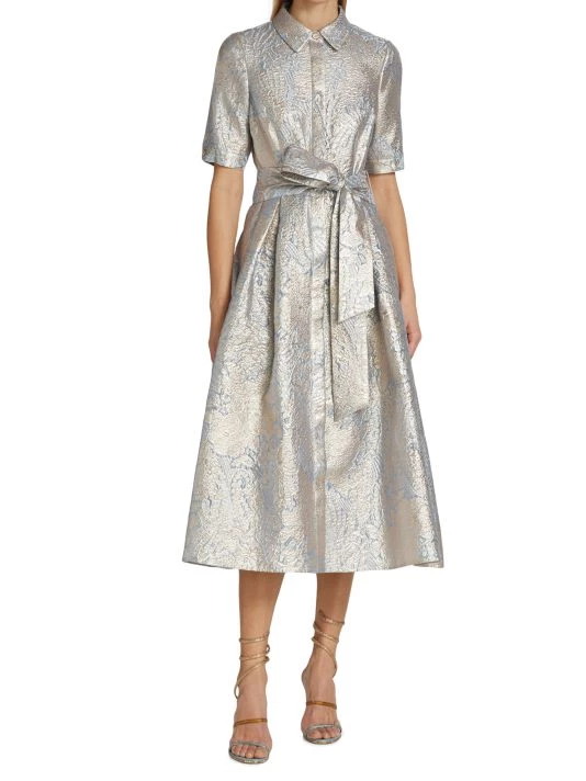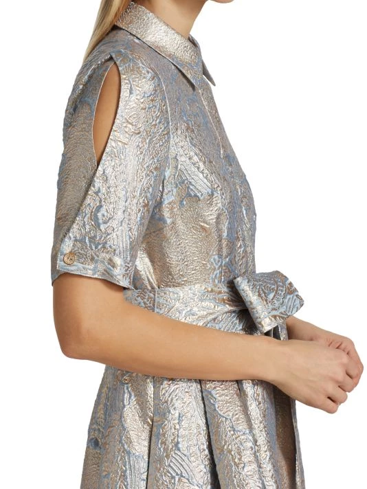 This button-up cocktail dress is crafted of a metallic jacquard fabric with cut outs at the sleeves.