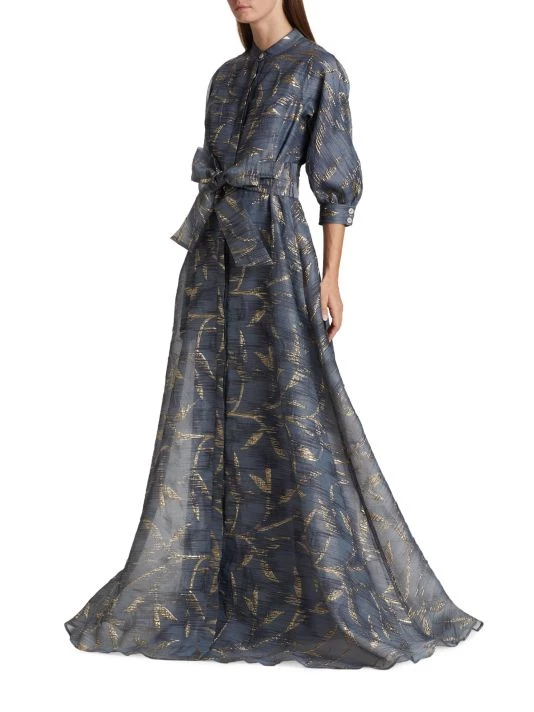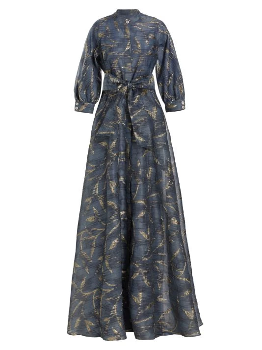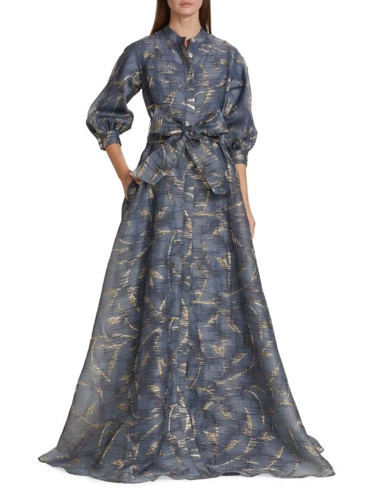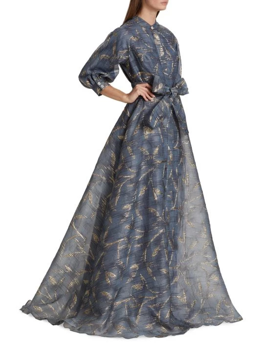 This metallic jacquard shirtwaist gown from Teri Jon by Rickie Freeman features a button-front bodice and flattering three-quater-length sleeves. A matching slef-tie belt completes this full A-line style.