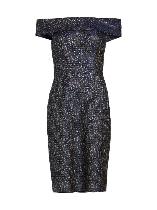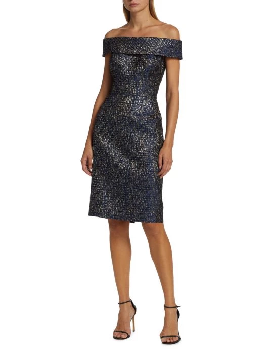 This Teri Jon by Rickie Freeman sheath dress is crafted of metallic jacquard. An off-the-shoulder neckline defines this knee-length style.