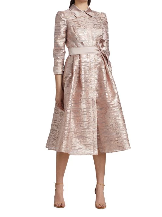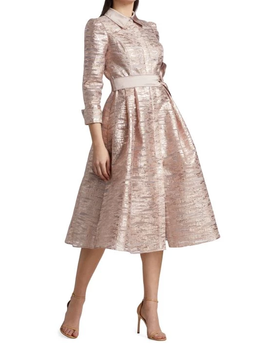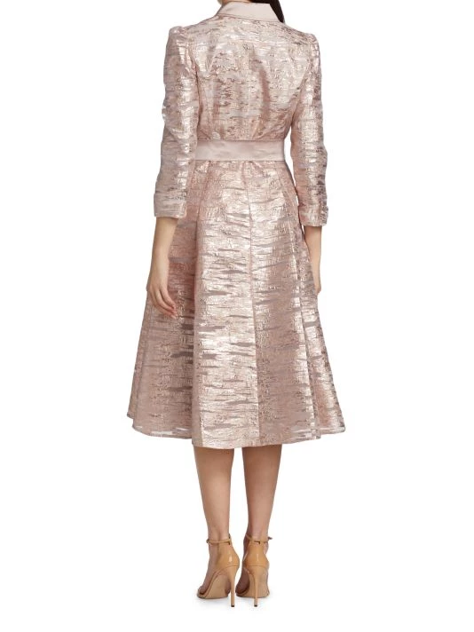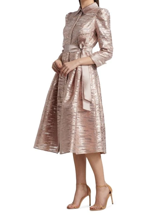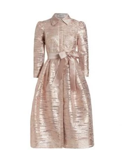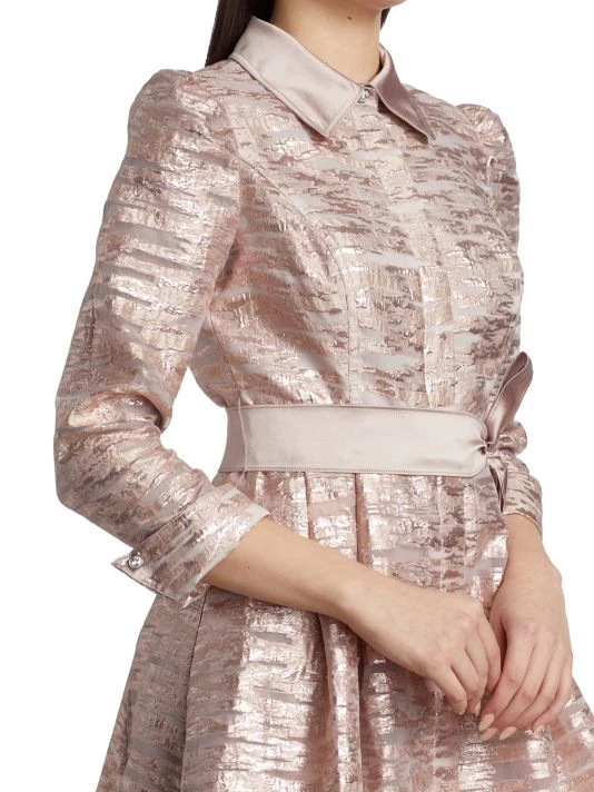 Enhanced with puff shoulders, Teri Jon by Rickie Freeman’s shirtdress is expertly crafted of lightweight metallic organza with satin trim. The luxurious fashion brand cinches this piece with a dainty belt.