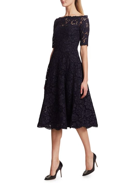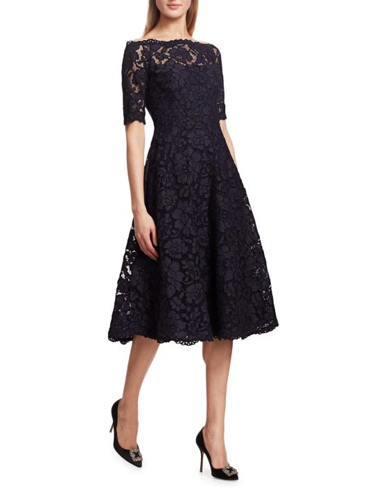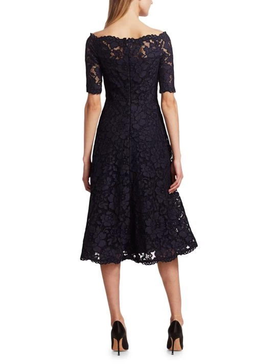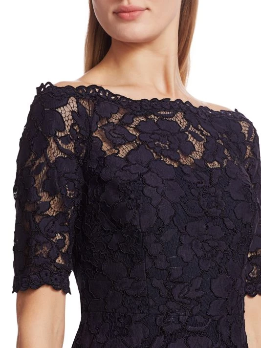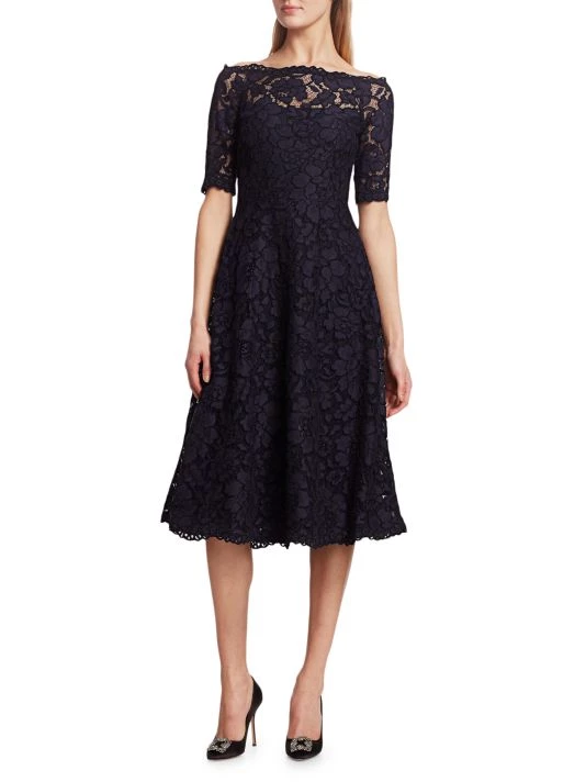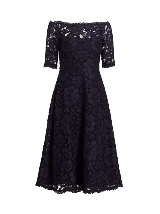 Allover lace with scalloped trim lends timeless elegance to this gorgeous off-the-shoulder dress with classic A-line silhouette.