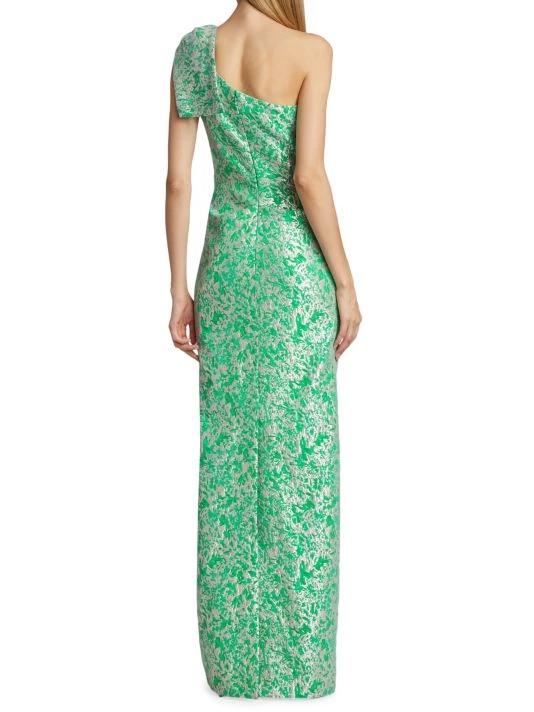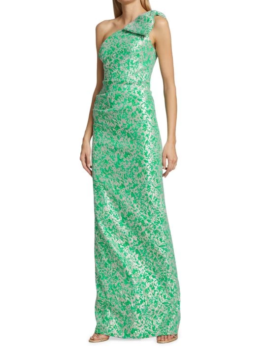 Lustrous textured jacquard gown with a large bow-embellishment at one-shoulder neckline and high back slit.