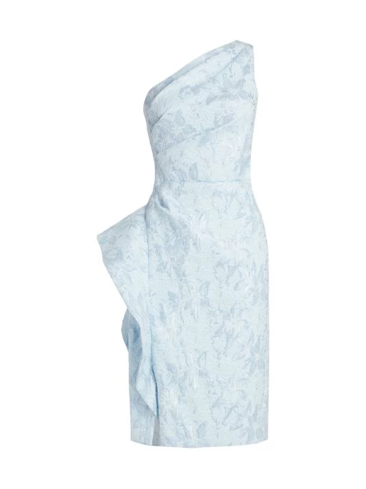 This one-shoulder dress with allover jacquard motif features a rouched side peplum design with cascading ruffle trim.