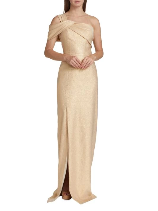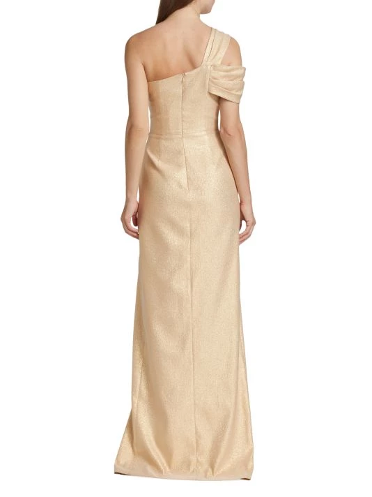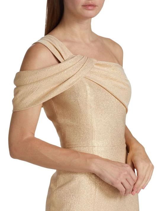 Cut in a one-shoulder silhouette, Teri Jon by Rickie Freeman’s gown is elevated by a twisted draped sleeve and metallic jacquard fabrication.