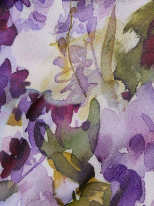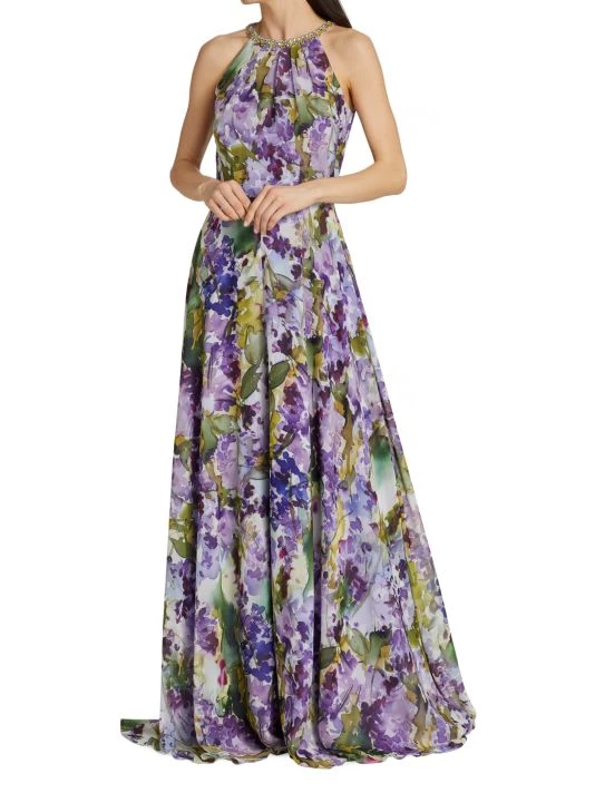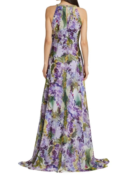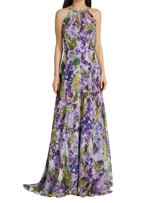 This elegant A-line gown gathers at the embellished neckline, featuring a romantic paintery-inspired floral motif.