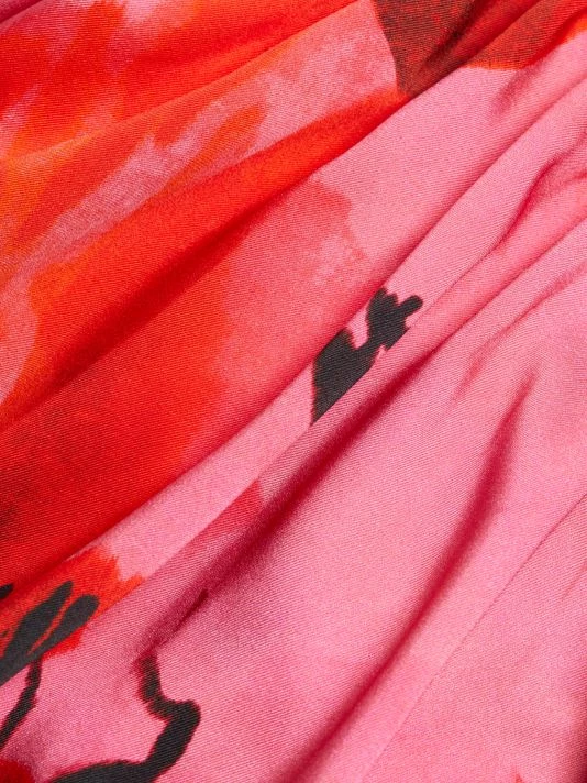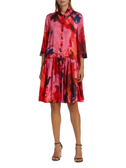 This printed satin twill shirtdress from Teri Jon by Rickie Freeman features a ruffled collar and a button-front placket. A drop-waist skirt defines this relaxed-fit style.